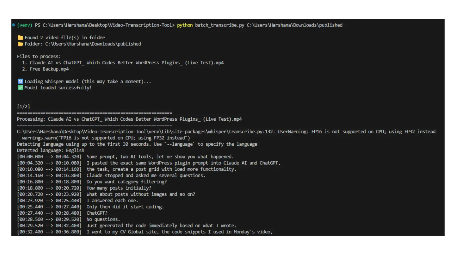 You can modify the output format in the batch_transcribe_folder function (starting at line 79) to match your exact needs. This is where you learn by doing—open the code in VS Code, experiment, and see what happens!